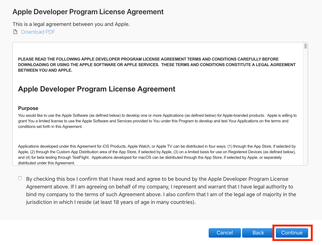 After that you’ll be asked to read through the Apple developer account agreement. Read through this then check the checkbox confirming that you’ve read it, and click Continue.