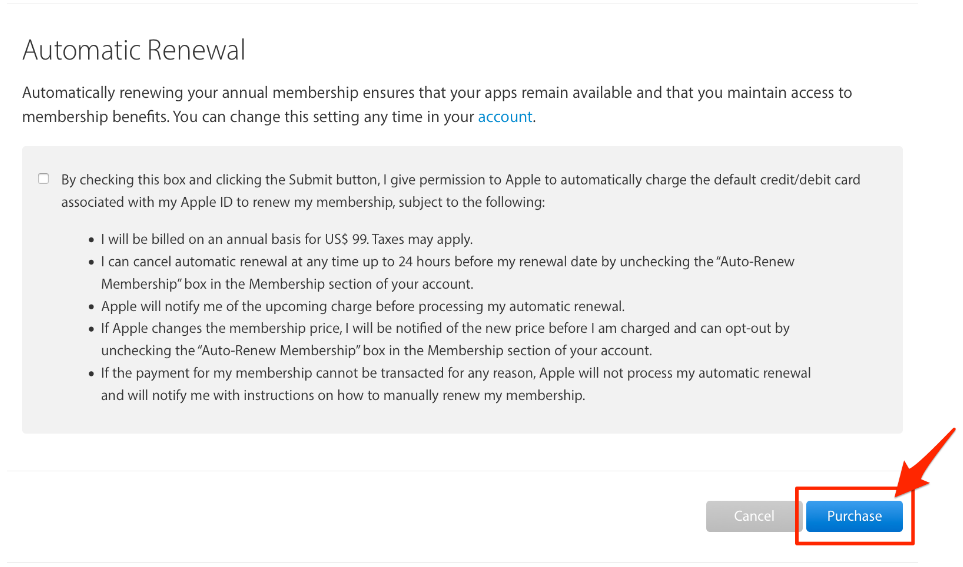 Next you’ll be brought to a screen telling you how much the enrollment fee will cost and it’s duration. You’ll also have the option to enable automatic renewal which will help you if you’d like to not worry about renewing your plan each year. Go ahead and check the box if you’d like to enable this (you can always disable it later) then click Purchase to move onto paying for your developer account.